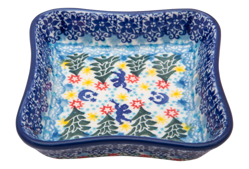 Unique Christmas pattern with Christmas trees, stars, snow, moon and an angels playing the trumpet. Green and blue ornament on the edges of the pattern. The edge in navy blue. Boleslawiec pottery - handpainted.