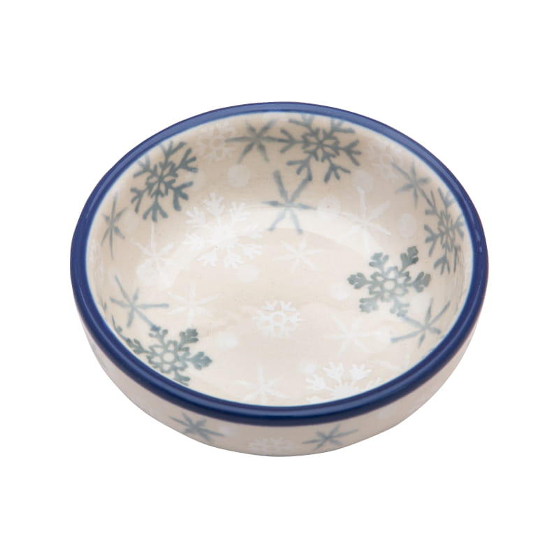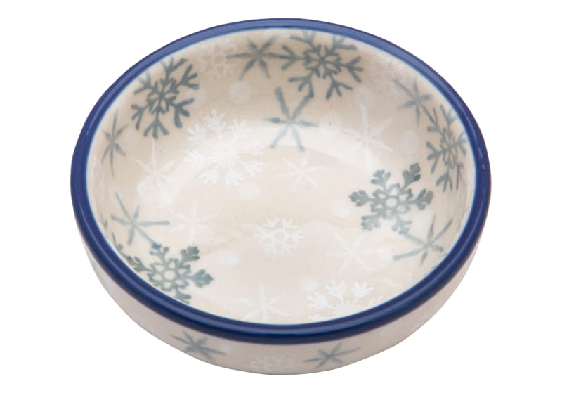 Winter pattern with snowflakes in shades of white and gray. The edge in navy blue. Boleslawiec pottery - hand painted.