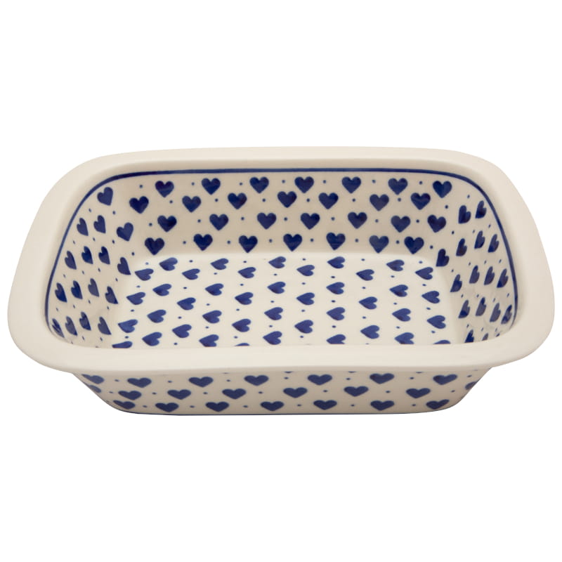 Boleslawiec pottery - handpainted. Classic pattern in a vintage style. Navy blue hearts on a white background. The edge in navy blue and white.
