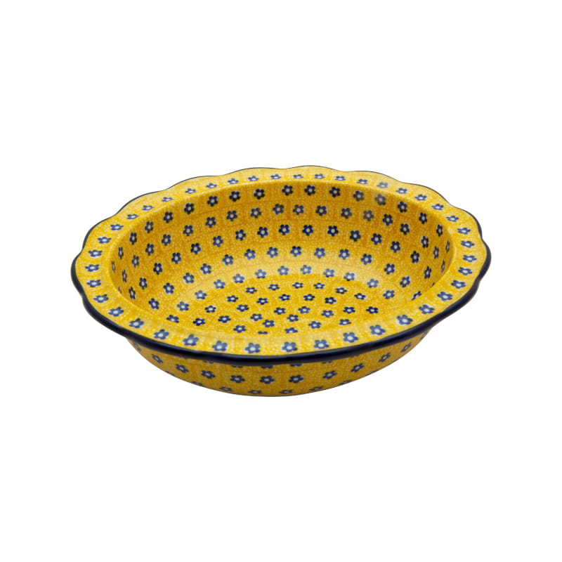 Classic floral pattern, with navy blue flowers on a yellow background. The edge in navy blue. Boleslawiec pottery - handpainted.