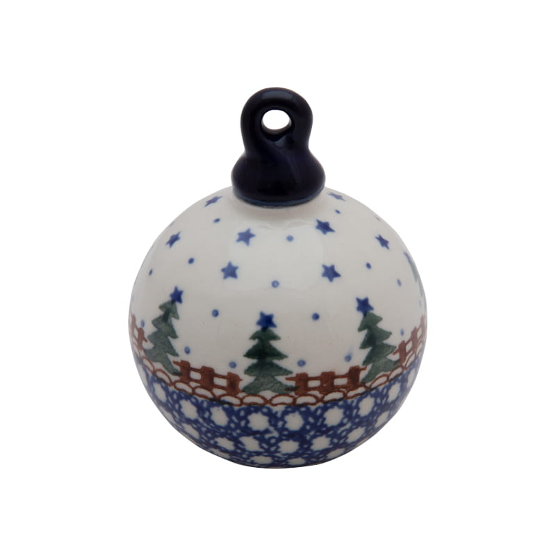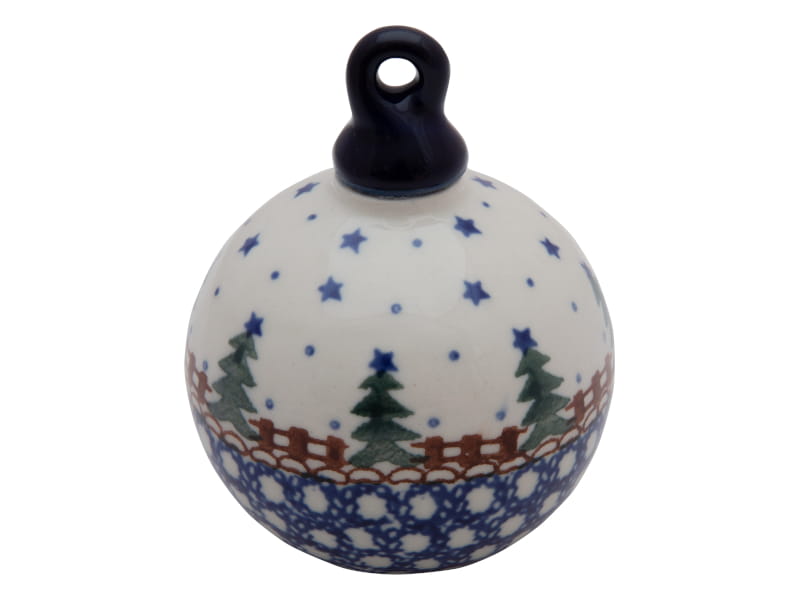 Wzór świąteczny w stylu vintage w kolorach błękitu z choinką, gwiazdkami i śniegiem. Geometryczny wzór kółka i brązowy płot. Wykończenie obrzeża w kolorze granatowym. Ceramika Bolesławiec - HANDMADE.