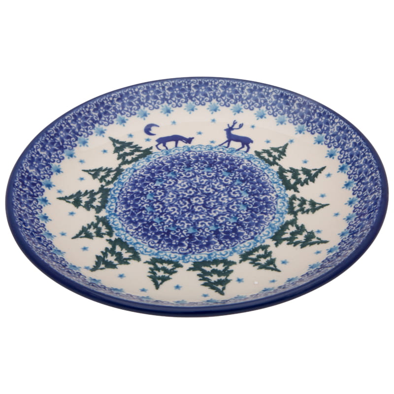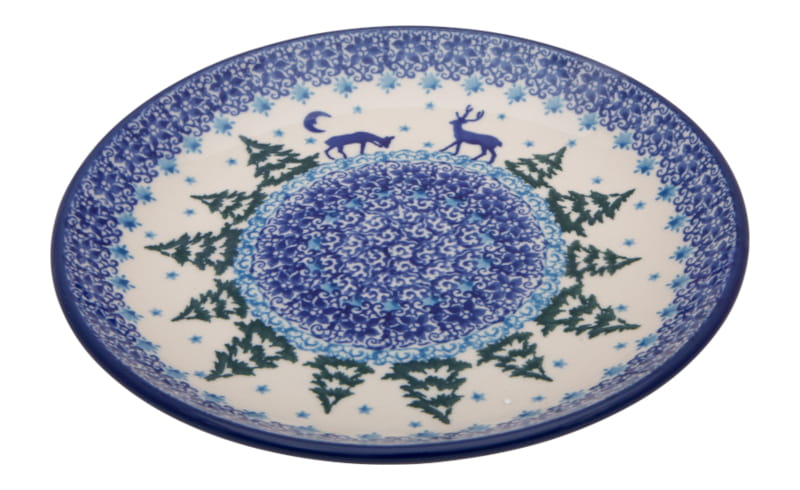 Christmas pattern with deers and winter landscape in the forest. Spruces, starry sky, snow. The edge in navy blue. Boleslawiec pottery - handpainted.