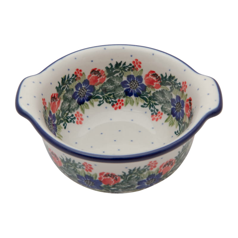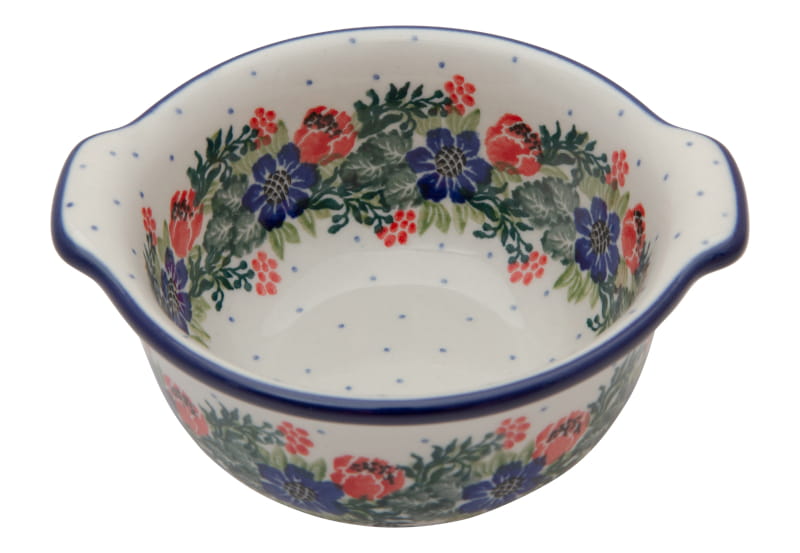 Ceramika Bolesławiec - HANDMADE. Wzór KWIATOWY z kwiatami w kolorach czerwonym i granatowym. Wykończenie obrzeża w kolorze granatowym.