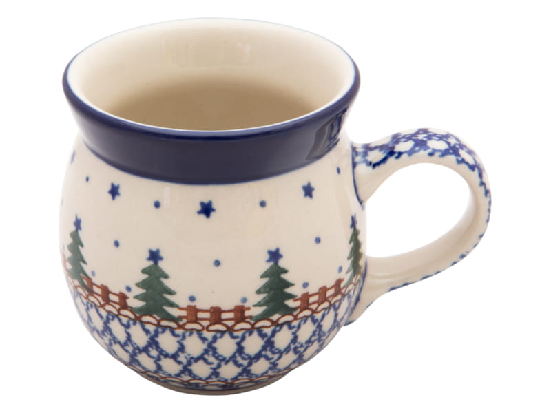 Christmas pattern in vintage style in blue and brown colors with a Christmas tree, stars and snow. Geometric circle pattern and brown fence. The edge in navy blue. Boleslawiec pottery - handpainted.