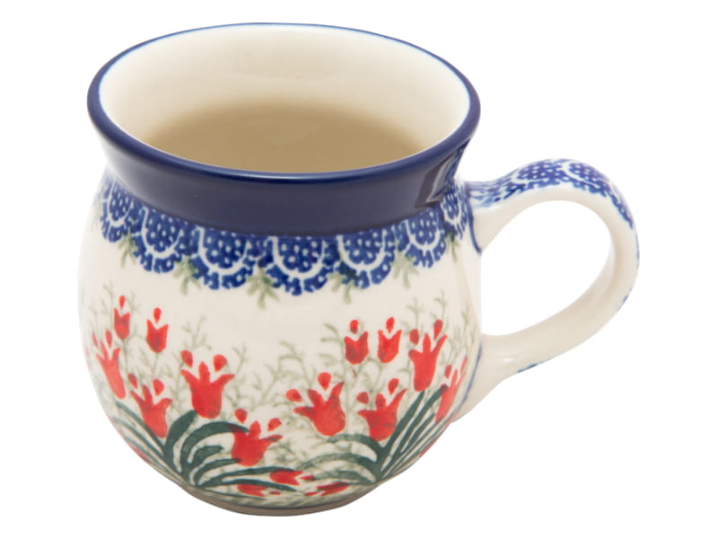 Floral pattern. Delicate red bellflowers. Ornament in blue and dirty green colors. The edge in navy blue. Boleslawiec pottery - handpainted.