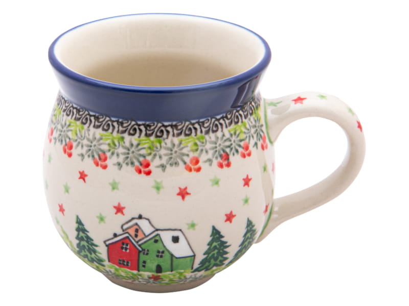 UNIQUE pattern. Winter pattern in shades of green and red. Houses, stars and spruces with plant ornaments. Boleslawiec pottery - handpainted.