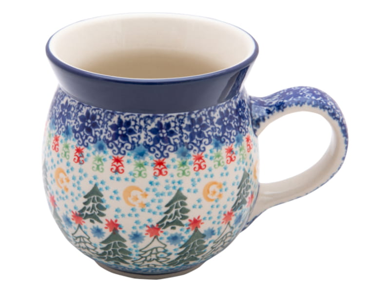 Unique multicolor Christmas pattern with Christmas trees, stars, snow and moon. Green and blue ornament on the edges of the pattern. The edge in navy blue. Boleslawiec pottery - handpainted.