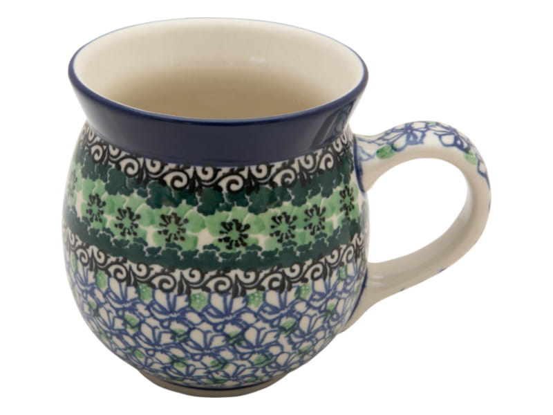 Ornamental floral pattern in shades of green, black and navy blue. The edge in navy blue. Boleslawiec pottery - handpainted.