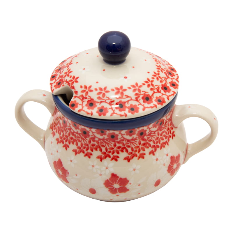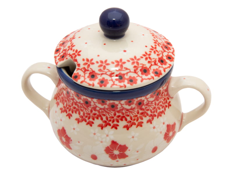 Ceramika Bolesławiec - HANDMADE. Wzór z kwiatami w stonowanych, delikatnych barwach - czerwieni i bieli. Wykończenie obrzeża w kolorze granatowym.