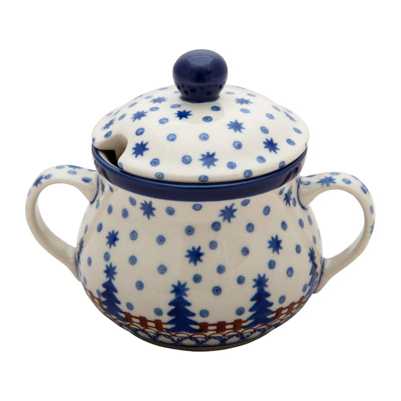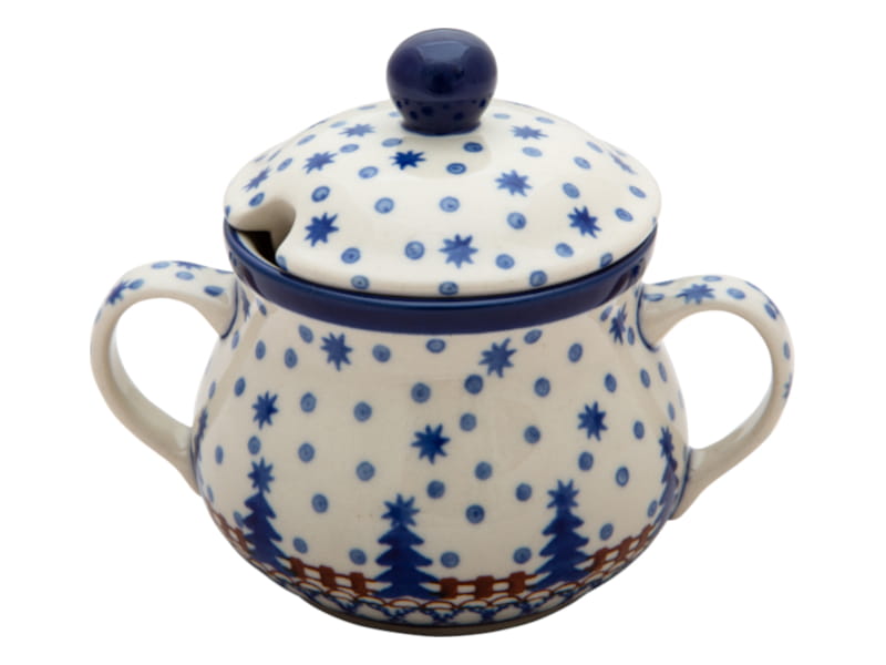 Wzór świąteczny w stylu vintage w kolorach błękitu i brązu z choinką, gwiazdkami i śniegiem. Wykończenie obrzeża w kolorze granatowym. Ceramika Bolesławiec - HANDMADE.