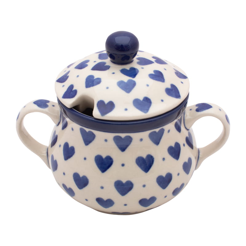 Ceramika Bolesławiec - HANDMADE. Wzór KLASYCZNY w stylu VINTAGE. Granatowe serca na białym tle. Wykończenie obrzeża w kolorze granatowym.
