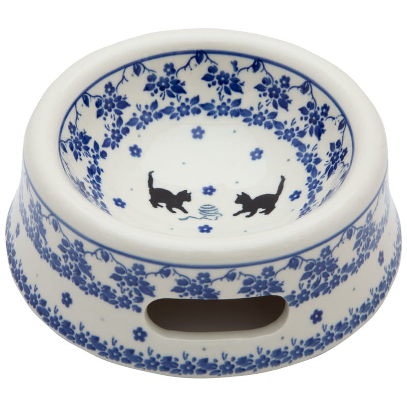 Design with cats in shades of blue and black. Cats playing with a ball of wool surrounded by floral patterns. The edge is finished in navy blue. Boleslawiec pottery - handpainted.