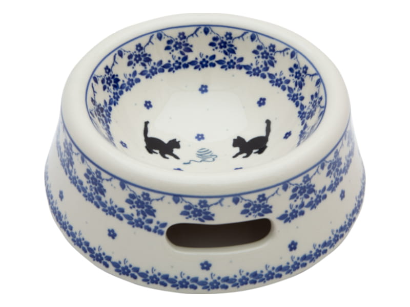 Pattern with cats in shades of blue and black. Cats playing with a ball of wool surrounded by floral patterns. The edge is finished in navy blue. Boleslawiec pottery - handpainted.