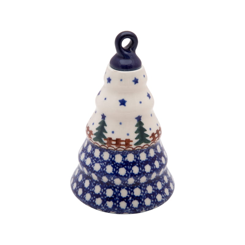 Christmas pattern in vintage style in blue and brown colors with a Christmas tree, stars and snow. Geometric circle pattern and brown fence. The edge in navy blue. Boleslawiec pottery - handpainted.