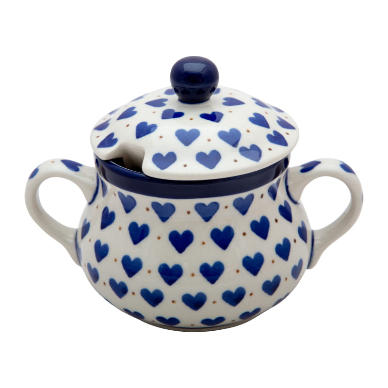 Ceramika Bolesławiec - HANDMADE. Wzór KLASYCZNY SERCE - granatowe serca i drobne kropki w kolorze czerwonym.