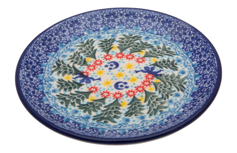 Unique Christmas pattern with Christmas trees, stars, snow, moon and an angels playing the trumpet. Green and blue ornament on the edges of the pattern. The edge in navy blue. Boleslawiec pottery - handpainted.
