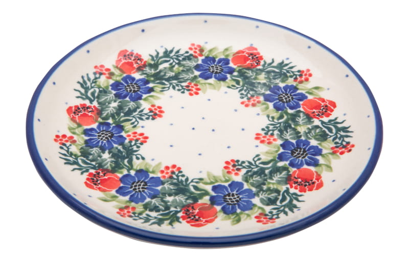 Boleslawiec pottery - handpainted. Floral pattern in red, blue and green. Roses, poppies and delphinium. The edge in navy blue.