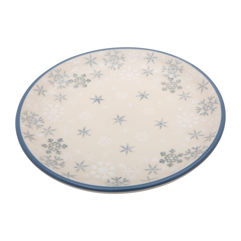 Winter pattern with snowflakes in shades of white and gray. The edge finished in grey-green. Boleslawiec pottery - handpainted.