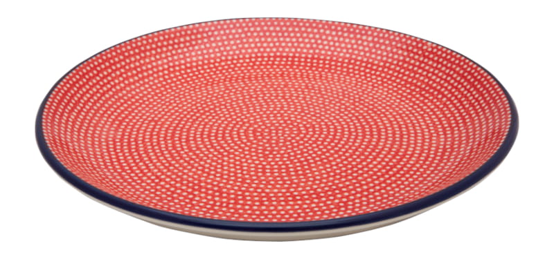 Boleslawiec pottery - handpainted. Unique pattern in a classic style - fine dots on a red background. The edge in navy blue.