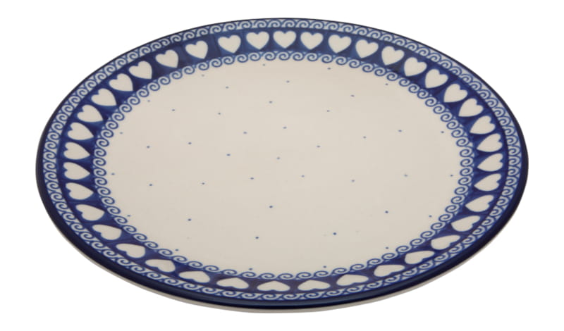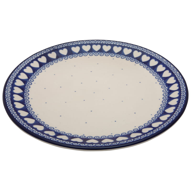 Classic pattern - a strip of white hearts on a navy blue background, fine dots and spirals in navy blue. Border in navy blue. Boleslawiec pottery - handpainted.