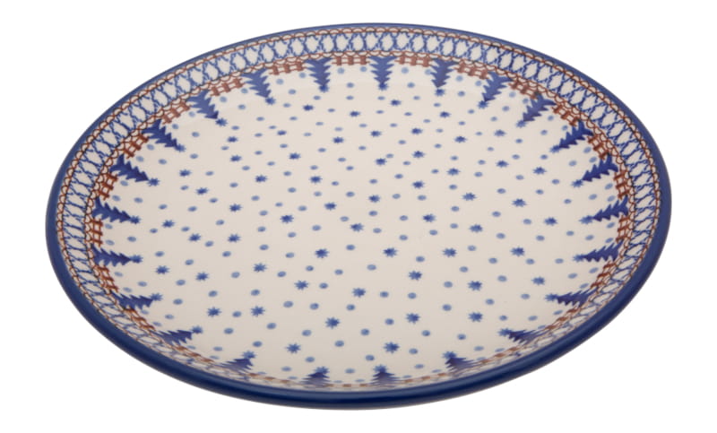 Christmas pattern in vintage style in blue and brown colors with a Christmas tree, stars and snow. The edge in navy blue. Boleslawiec pottery - handpainted.