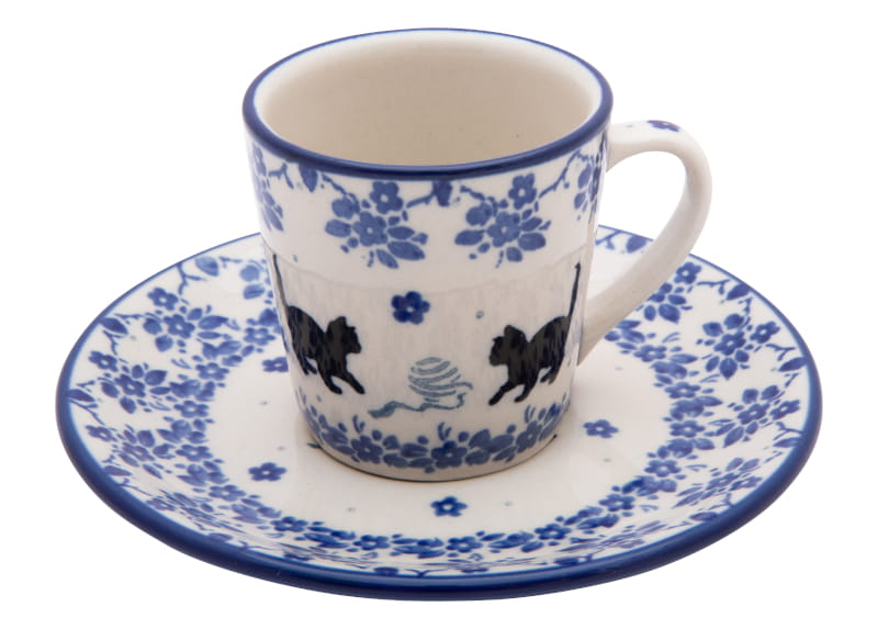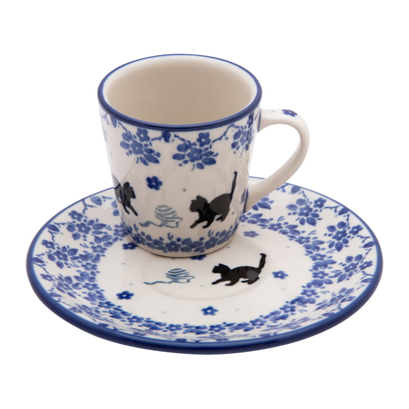 Design with cats in shades of blue and black. Cats playing with a ball of wool surrounded by floral patterns. The edge is finished in navy blue. Boleslawiec pottery - handpainted.