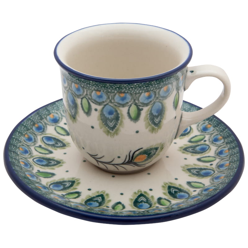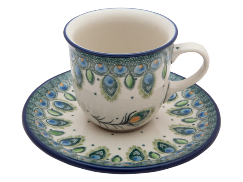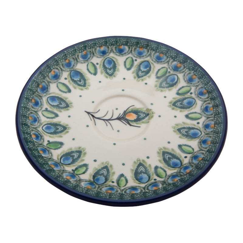 Niepowtarzalny motyw PAWICH PIÓR. Wzór w kolorach zieleni i kobaltowego błękitu. Wykończenie obrzeża w kolorze granatowym. Ceramika Bolesławiec - HANDMADE.