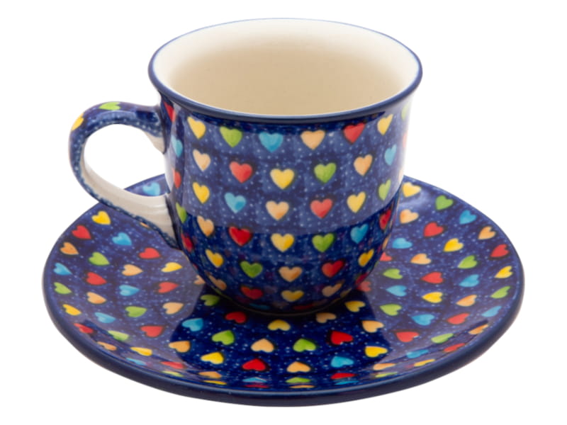 Wzór UNIKATOWY - wzór serce. Różnokolorowe serca na granatowym tle. Wykończenie obrzeża w kolorze granatowym. Ceramika Bolesławiec - HANDMADE.