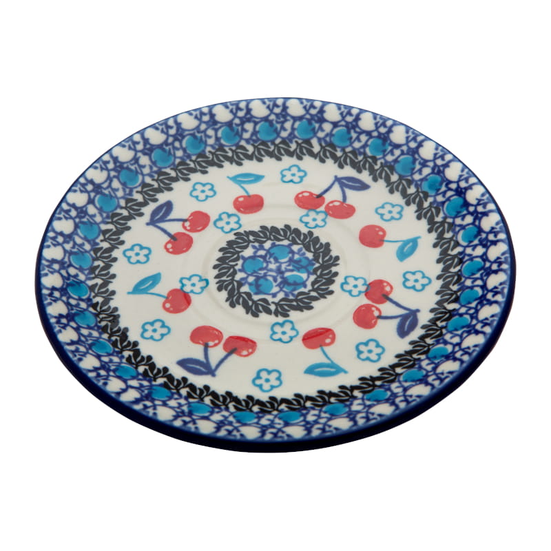 Wzór CZEREŚNIOWY SAD - czerwone czereśnie z niebieskim listkiem. Niebiesko-czarny roślinny ornament wokół. Wykończenie obrzeża w kolorze granatowym. Ceramika Bolesławiec - Handmade.