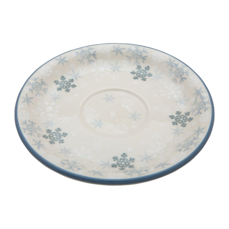 Wzór zimowy z płatkami śniegu w odcieniach bieli i szarego. Wykończenie obrzeża w kolorze szarozielonym. Ceramika Bolesławiec - HANDMADE.