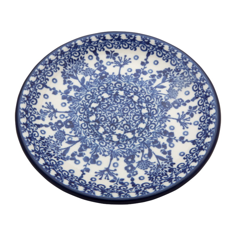 Wzór w granatową łąkę. Dekoracja folkowa w kwiaty i motyle. Wykończenie obrzeża w kolorze granatowym. Ceramika Bolesławiec - Handmade.