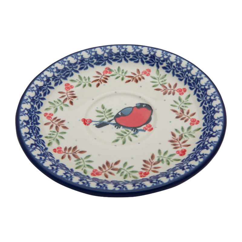 Wzór Unikatowy. Ptaki Gile na gałęzi w kolorach jesieni. Liście i owoce jarzębiny. Wykończenie obrzeża w kolorze granatowym. Ceramika Bolesławiec - HANDMADE.