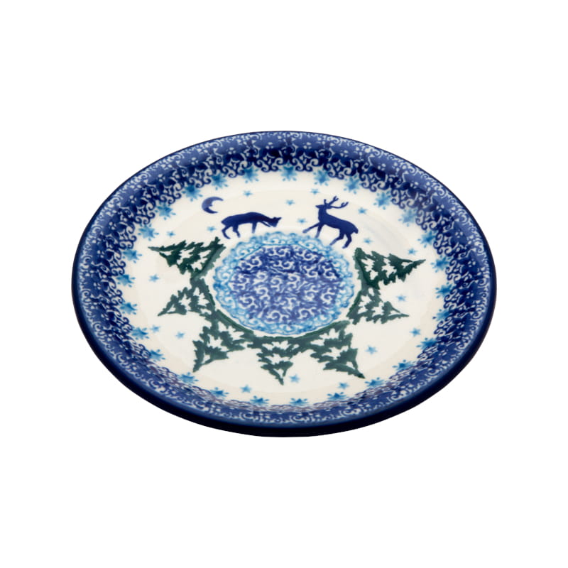 Dekoracja RENIFERY Bolesławiec. Wzór świąteczny z jeleniami i zimowym krajobrazem w lesie. Choinki, świerki, gwiaździste niebo, śnieg. Wykończenie obrzeża w kolorze granatowym. Ceramika Bolesławiec - HANDMADE.