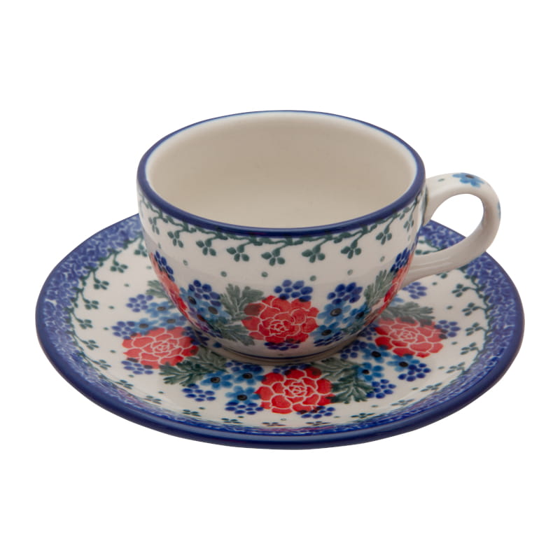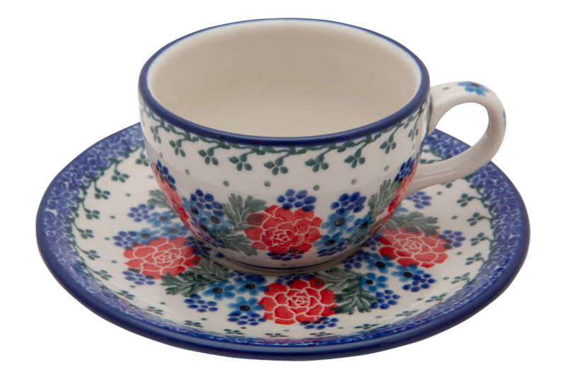 Wzór kwiatowy w dominujących kolorach: czerwonym i niebieskim. Wykończenie obrzeża w kolorze granatowym. Ceramika Bolesławiec - HANDMADE.