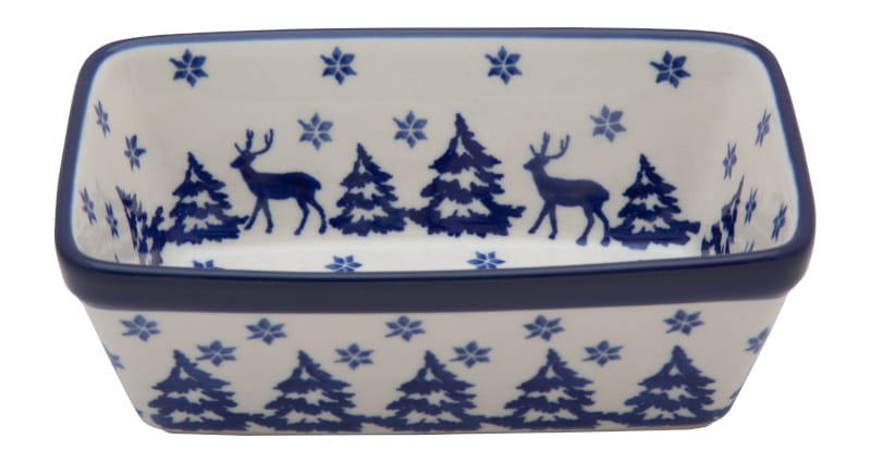 CCeramika Bolesławiec - HANDMADE. Wzór zimowy w kolorze granatowym. Wykończenie obrzeża w kolorze granatowym. Wzór w płatki śniegu, renifery i choinki.