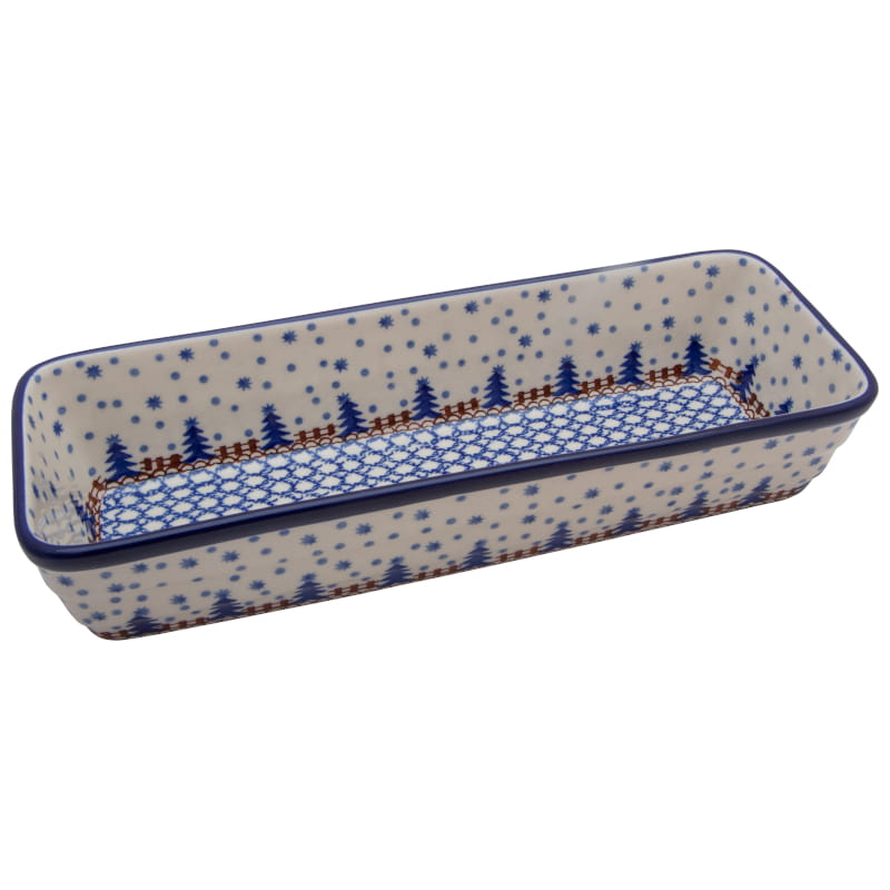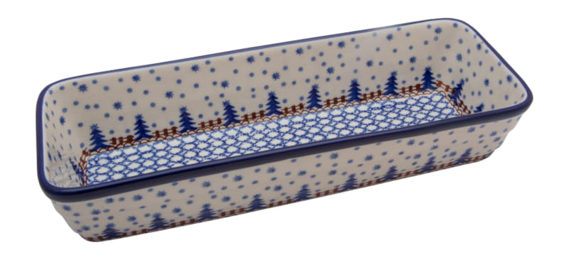 Wzór świąteczny w stylu vintage w kolorach błękitu i brązu z choinką, gwiazdkami i śniegiem. Wykończenie obrzeża w kolorze granatowym. Ceramika Bolesławiec - HANDMADE.