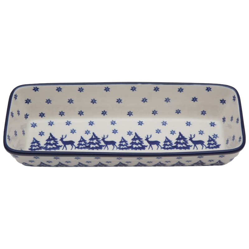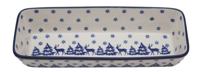 CCeramika Bolesławiec - HANDMADE. Wzór zimowy w kolorze granatowym. Wykończenie obrzeża w kolorze granatowym. Wzór w płatki śniegu, renifery i choinki.