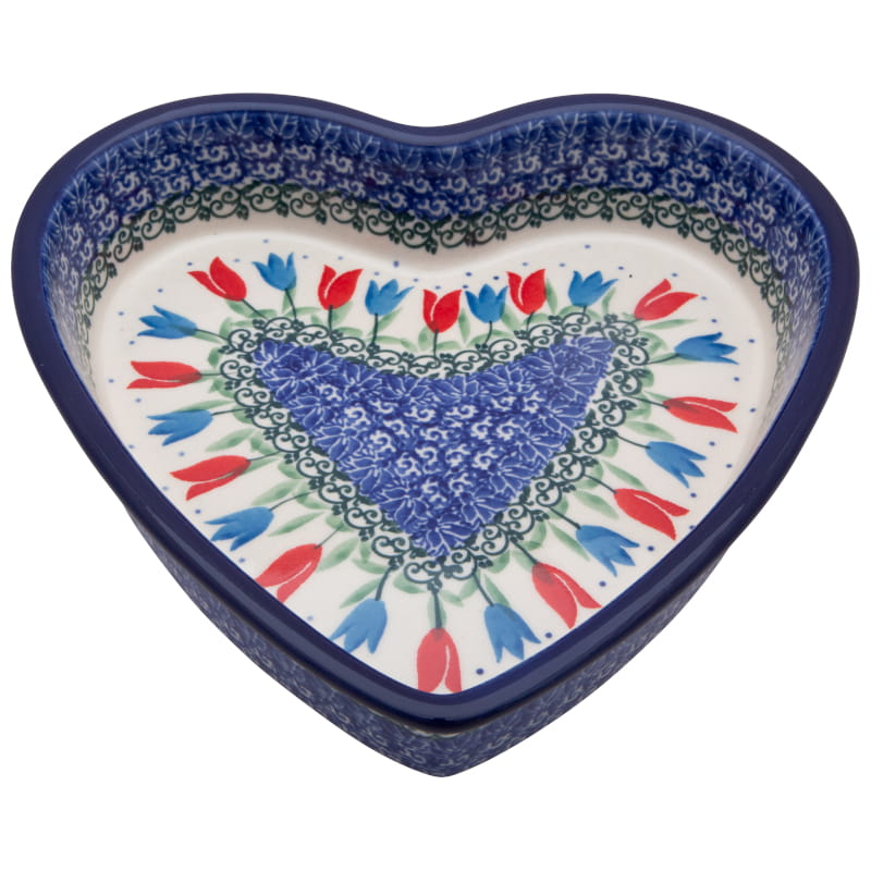 Pattern with tulips . Red betwwen blue. Delicate, ornamental green and blue floral motif around. The edge is finished in navy blue. Boleslawiec pottery - handpainted.