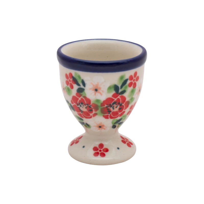 Ceramika Bolesławiec - HANDMADE. Wzór kwiatowy z dominującymi kolorami: czerwonym i białym. Wykończenie obrzeża w kolorze granatowym.