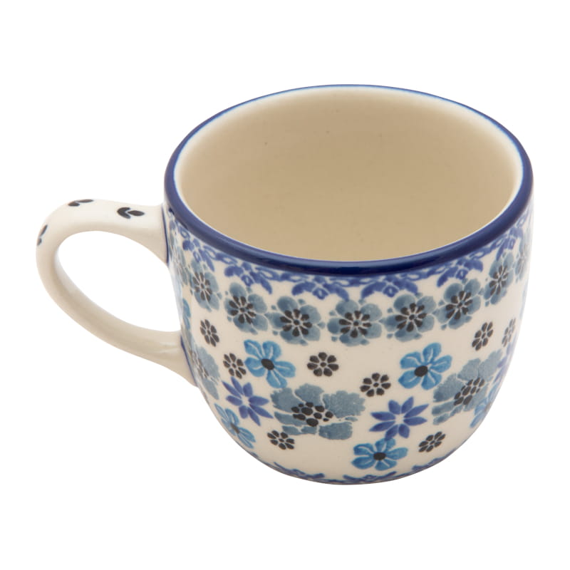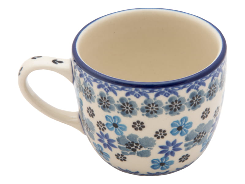 Ceramika Bolesławiec - handmade. Wzór kwiatowy w czerni i odcieniach niebieskiego. Wykończenie obrzeża w kolorze granatowym.