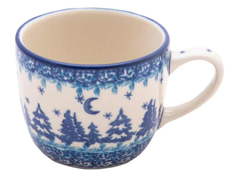 Wzór świąteczny, zimowy z lasem w nocy, przysypanym śniegiem. Ornament wokół. Wzór utrzymany w odcieniach niebieskiego. Wykończenie obrzeża w kolorze granatowym. Ceramika Bolesławiec - HANDMADE.