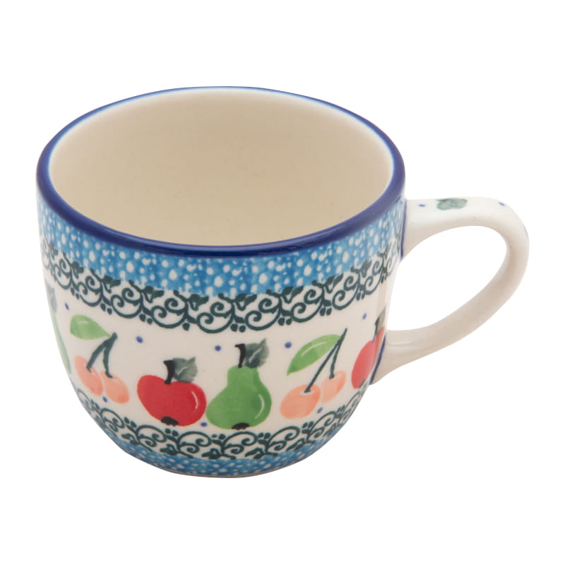 Wzór owocowy SAD - różowe czereśnie, czerwone jabłka i zielone gruszki. Niebiesko-zielony roślinny ornament wokół. Wykończenie obrzeża w kolorze granatowym. Ceramika Bolesławiec - Handmade.