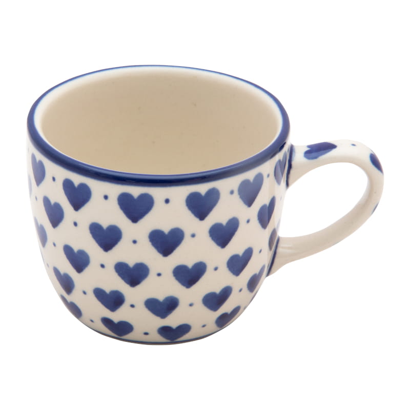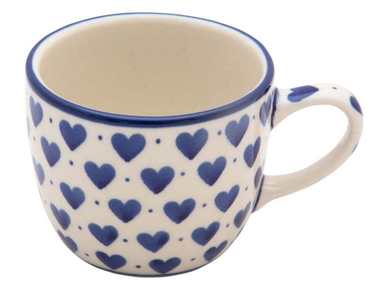 Ceramika Bolesławiec - HANDMADE. Wzór KLASYCZNY w stylu VINTAGE. Granatowe serca na białym tle. Wykończenie obrzeża w kolorze granatowym.