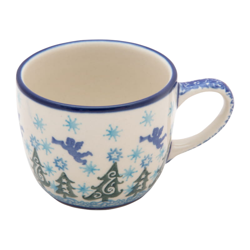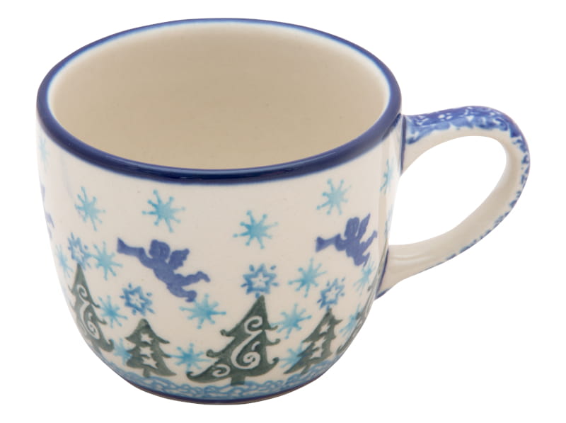 Wzór zimowy – błękitne śnieżynki, niebieskie aniołki i zielone choinki. Idealna do herbaty w chłodne dni. Obrzeże w kolorze granatowym. Ceramika Bolesławiec - handmade.