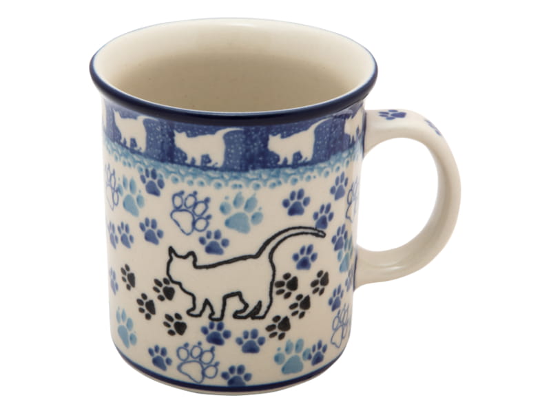 Wzór z kotem. Wokół ślady łap w odcieniach niebieskiego i czarnym. Wykończenie obrzeża w kolorze granatowym z motywem kotów. Ceramika Bolesławiec - Handmade.
