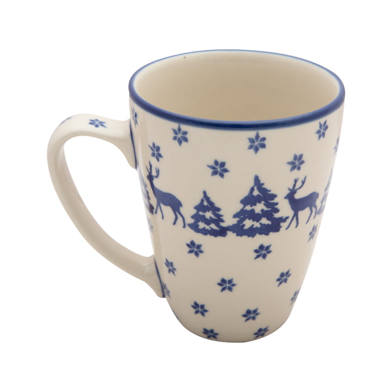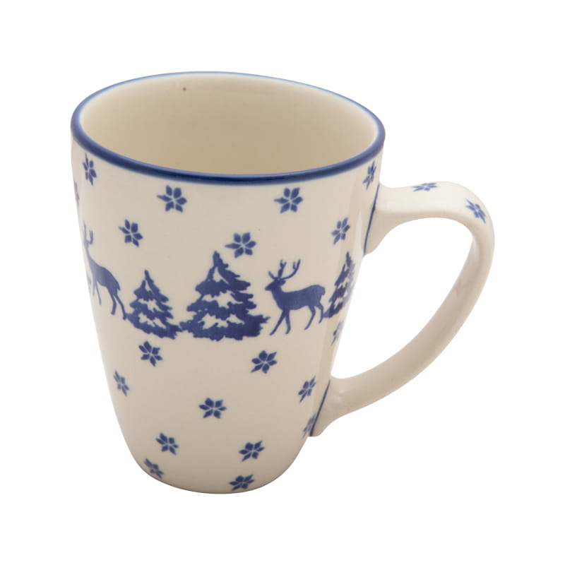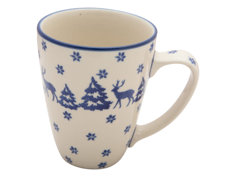 Wzór zimowy w kolorze granatowym. Wzór w płatki śniegu, renifery i choinki. Wykończenie obrzeża w kolorze granatowym. Ceramika Bolesławiec - HANDMADE.