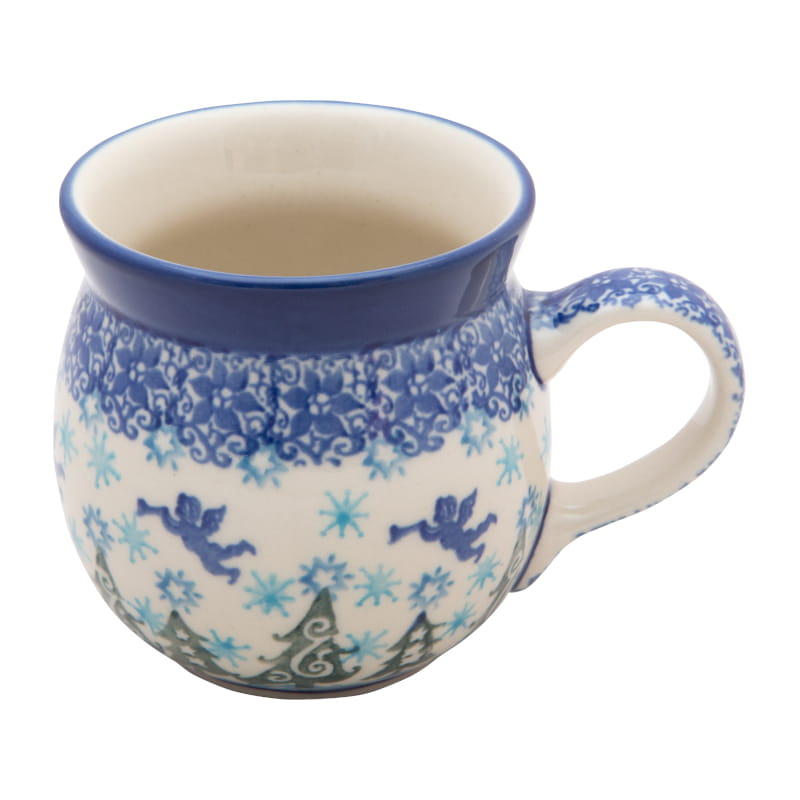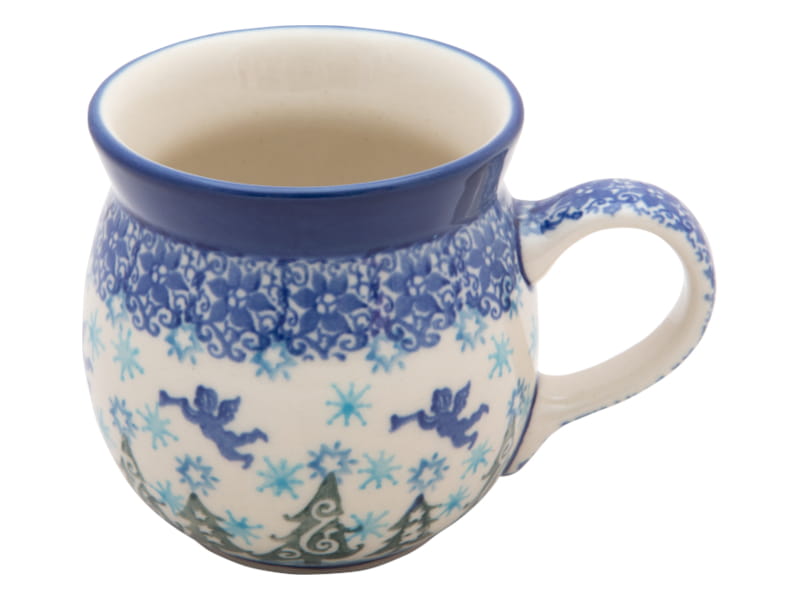 Wzór zimowy – błękitne śnieżynki, niebieskie aniołki i zielone choinki. Idealna do herbaty w chłodne dni. Obrzeże w kolorze granatowym. Ceramika Bolesławiec - handmade.