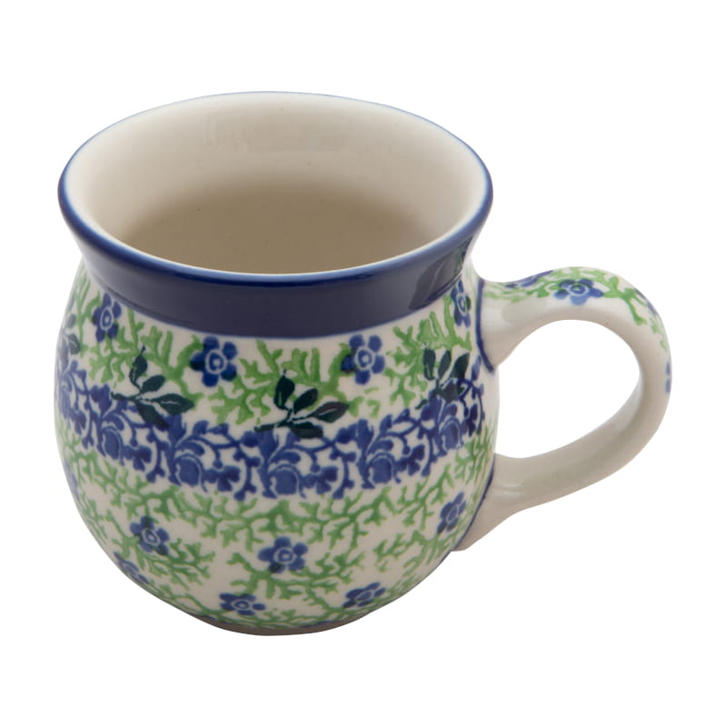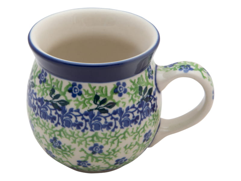 Klasyczny wzór kwiatowy z granatowymi kwiatami na zielonym tle. Wykończenie obrzeża w kolorze granatowym. Ceramika Bolesławiec - HANDMADE.