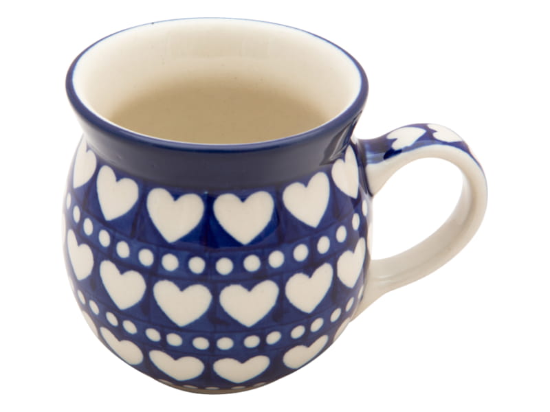 Wzór KLASYCZNY w stylu VINTAGE. Białe serca na granatowym tle przedzielone kropkami. Wykończenie obrzeża w kolorze granatowym. Ceramika Bolesławiec - HANDMADE.