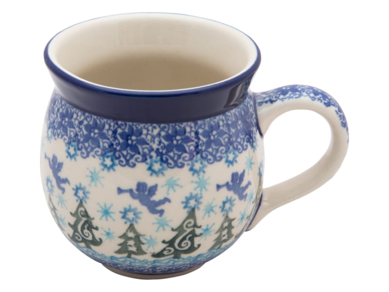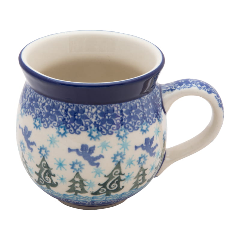 Wzór zimowy – błękitne śnieżynki, niebieskie aniołki i zielone choinki. Idealna do herbaty w chłodne dni. Obrzeże w kolorze granatowym. Ceramika Bolesławiec - handmade.